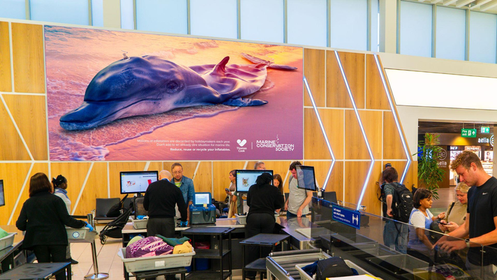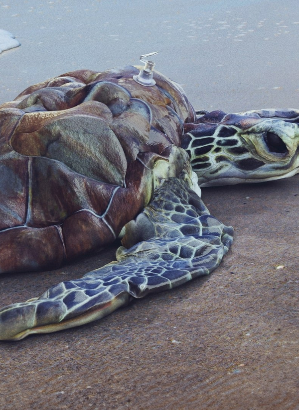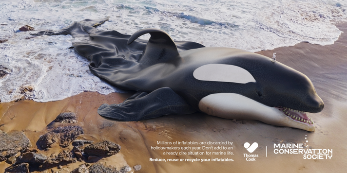 Created in partnership with The Marine Conservation Society, the stark images show a dolphin, a turtle and an orca whale deflated and washed up on the beach. A powerful reminder to reduce, reuse or recycle holiday inflatables.